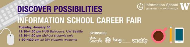 *Please note- the fair is restricted to iSchool students only from 12:30-1:30, then open to all UW students and alumni 1:30-onwards