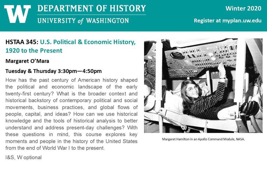 Looking for that last course to complete your Winter 2020 schedule? Want to learn more about modern U.S. political and economic history? Consider registering for HSTAA 345: U.S. Political & Economic History, 1920 to the Present! Taught by Dr. Margaret O’Mara, author of the recently published book “The Code: Silicon Valley and the Remaking of America,” this course will explore the changing role of government, electoral and partisan change, populism and grassroots activism, markets and corporations, labor force trends, and the social and political impact of technology. Please see the course flyer below for more details.