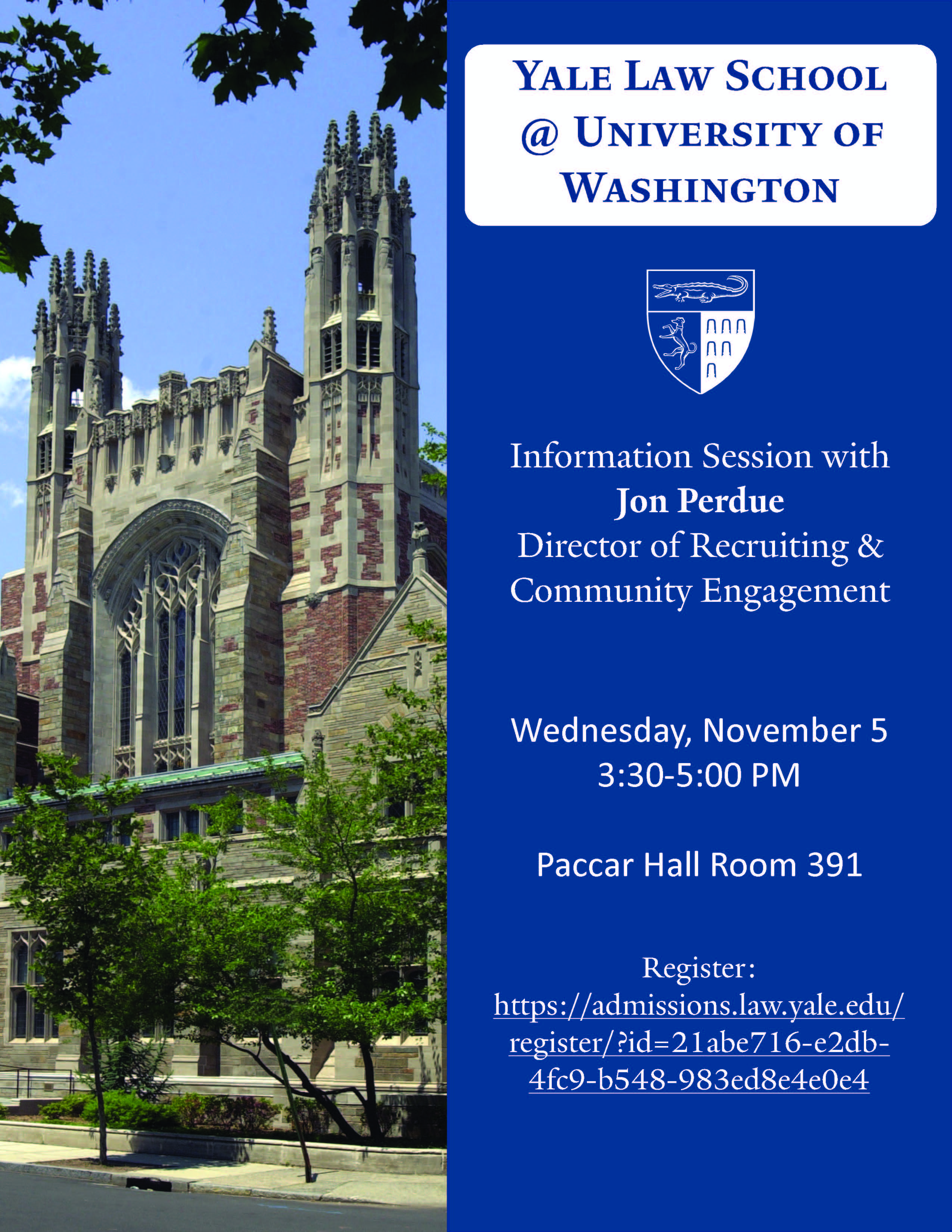 Join us for a private in-person open house for University of Washington students and alumni featuring Jon Perdue, Director of Recruiting & Community Engagement at Yale Law School. This is a great opportunity to learn more about Yale Law School, our unique admissions process, and our supportive community. There will also be lots of time for your questions!