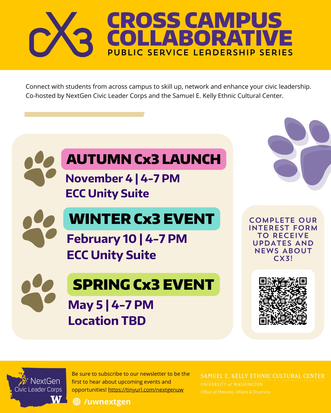 NextGen Civic Leader Corps and the Kelly Ethnic Cultural Center are excited to invite you to the launch of the Cross-Campus Collaborative (CX3) Public Service Leadership Seriesβa new, quarterly initiative designed to bring together undergraduate students from across the University of Washington to identify the most pressing complex societal challenges facing UW students. We will provide frameworks and tools from multiple disciplines to support collaborative and creative problem solving.