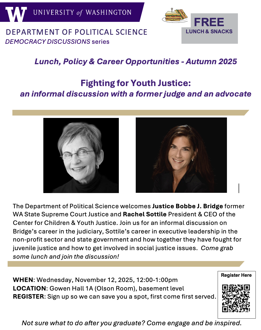 Justice Bobbe J. Bridge (retired WA State Supreme Court Judge) and Rachel Sottile (Pres & CEO of CCYJ with years of leadership experience in the non-profit sector). So if pursuing work in the legal field or in the non-profit field is your jam, make sure you don't miss this event!