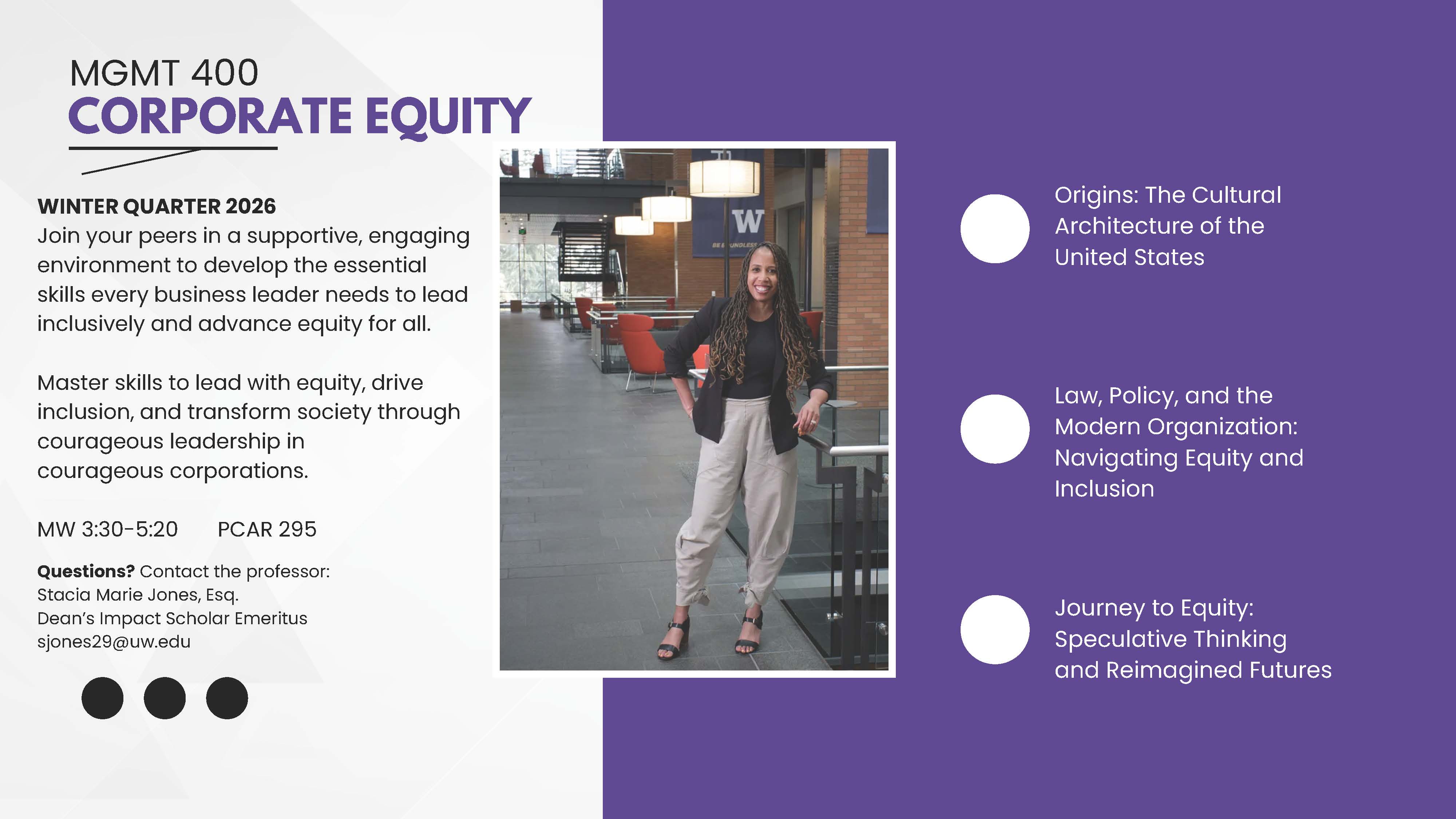 MGMT 400: Corporate Diversity, Equity, and Inclusion (4 credits – SLN: 17627) focuses on effective leadership through DEI, explores its intersection with law, customer influence, social justice, and employee activism. It is open to juniors and seniors and it counts for the DIV requirement.