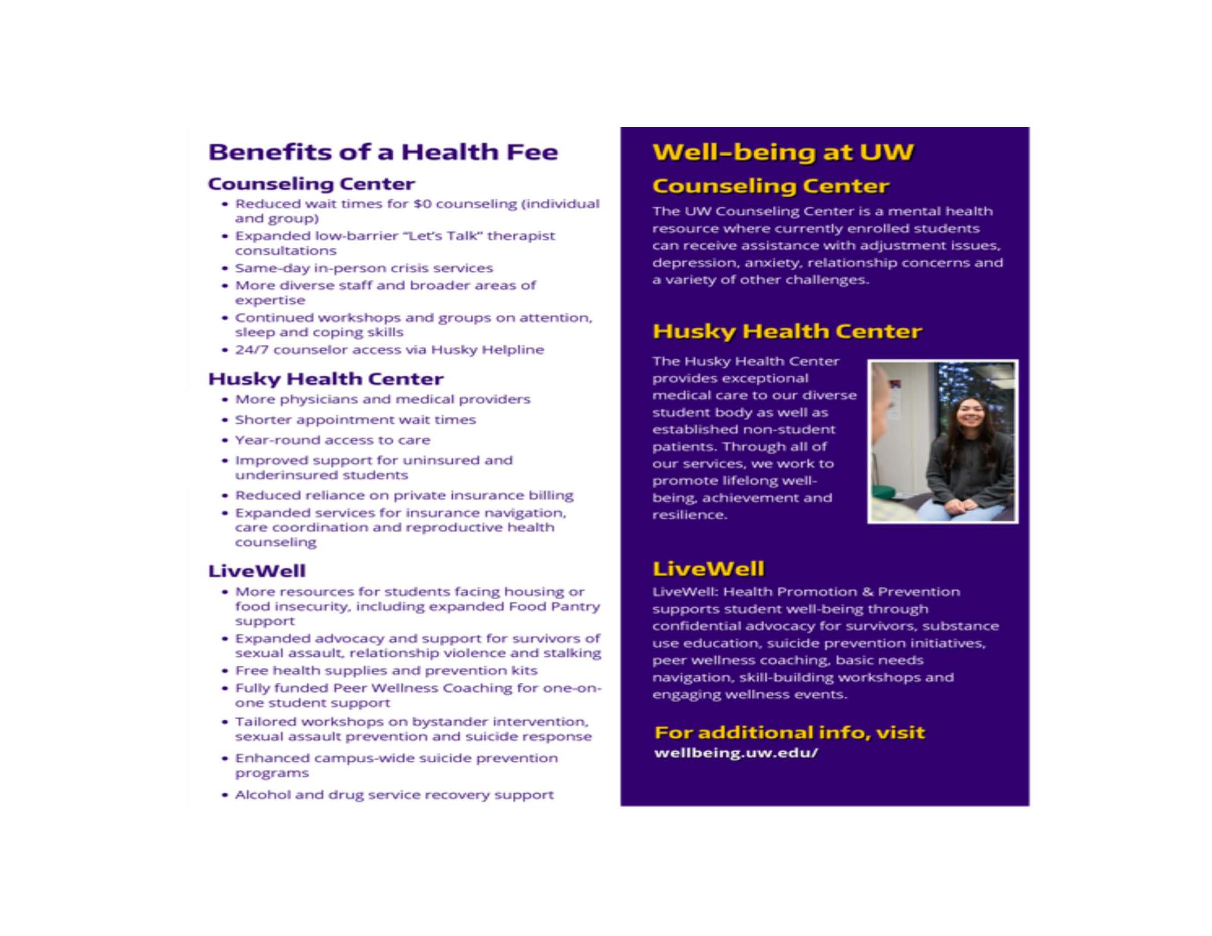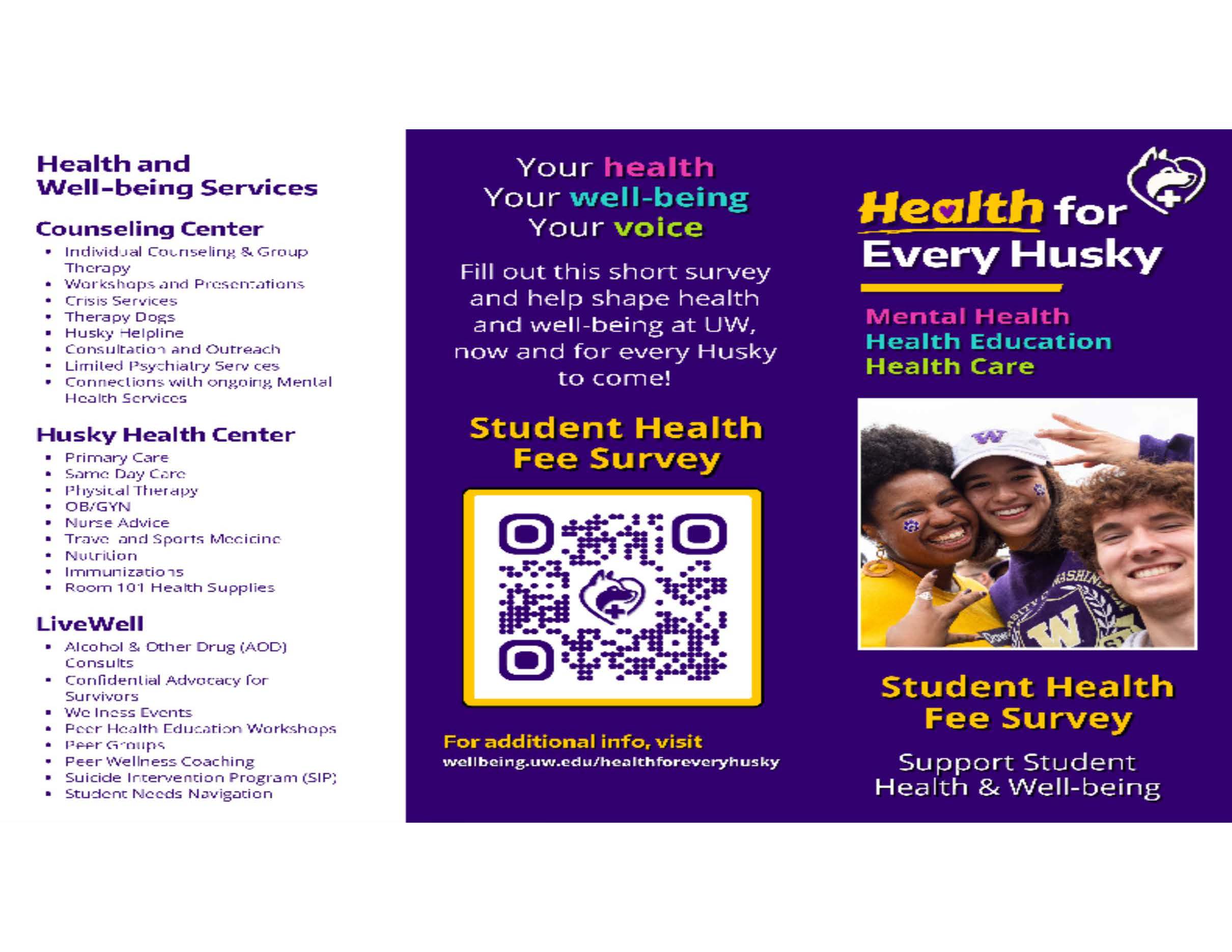 In collaboration with UW Health Units on campus (UW Counseling Center, LiveWell, and Husky Health), GPSS, and the Services and Activities Fee (SAF), ASUW is seeking student feedback on initiative to fund student health services called the Student Health Fee. The form closes on January 19 at 11:59 PM.