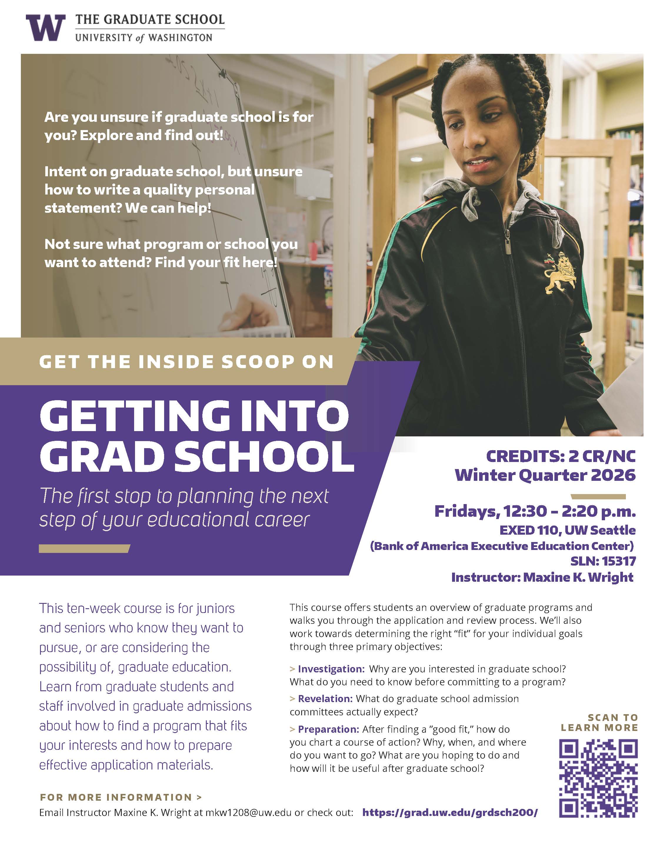 GRDSCH 200 offers an overview of the structure and organization of graduate education and focuses on helping students learn the skills to find resources, build a network, and make decisions about continuing their studies beyond the baccalaureate. This 10-week course is for UW juniors and seniors who will be reflecting on their next educational journey. Open to all majors and disciplines.
