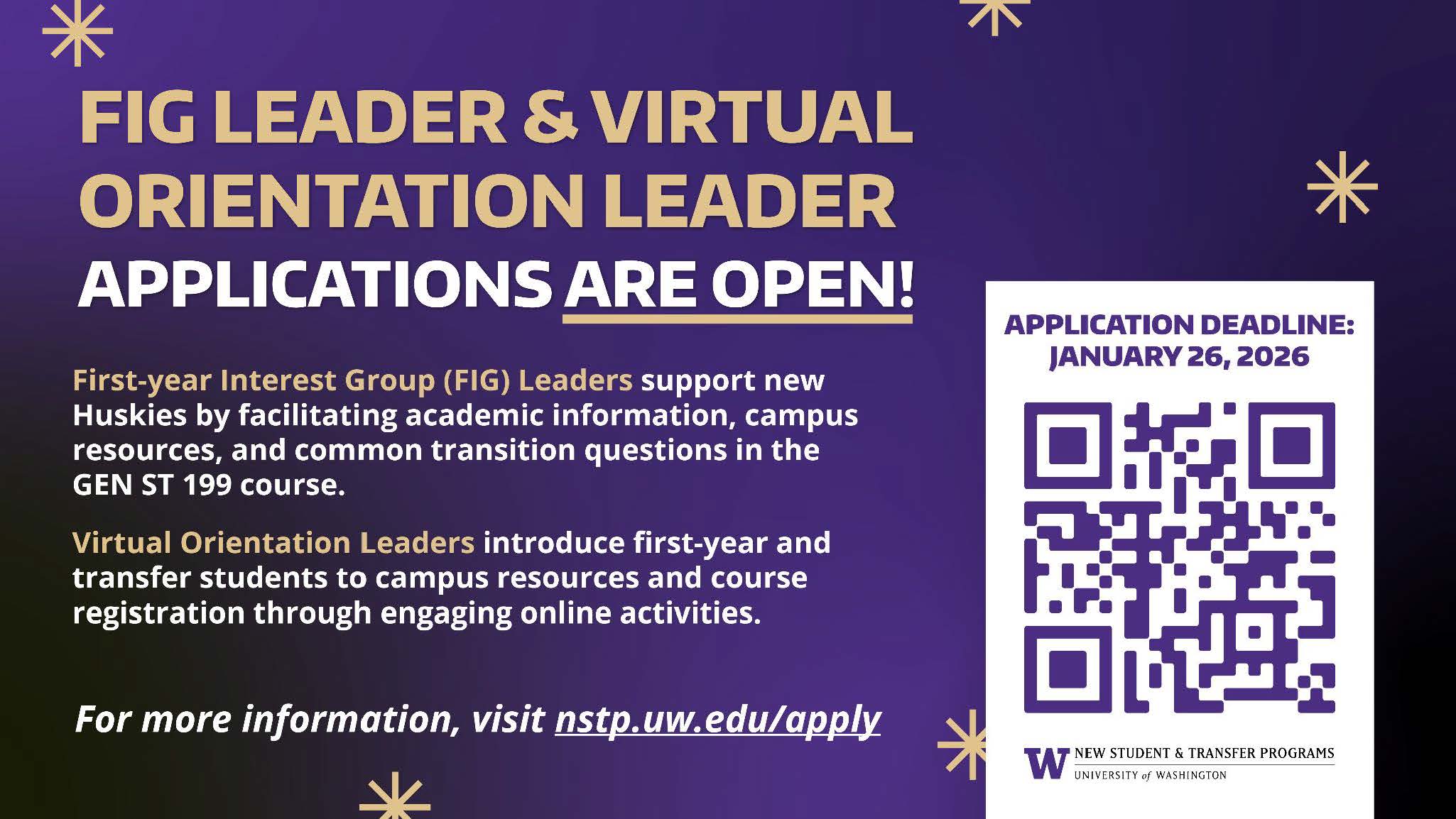 New Student & Transfer Programs is currently recruiting for our First-year Interest Group (FIG) Leader and Virtual Orientation Leader (VOL) student positions!