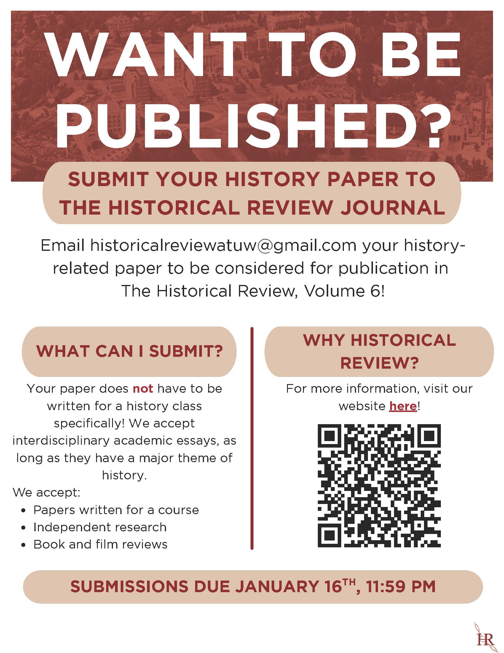 The Historical Review at UW is currently open for paper submissions for our Spring 2026 issue! We accept papers written for a course, independent research, and book and film reviews. For any other info on submission guidelines, see our website.