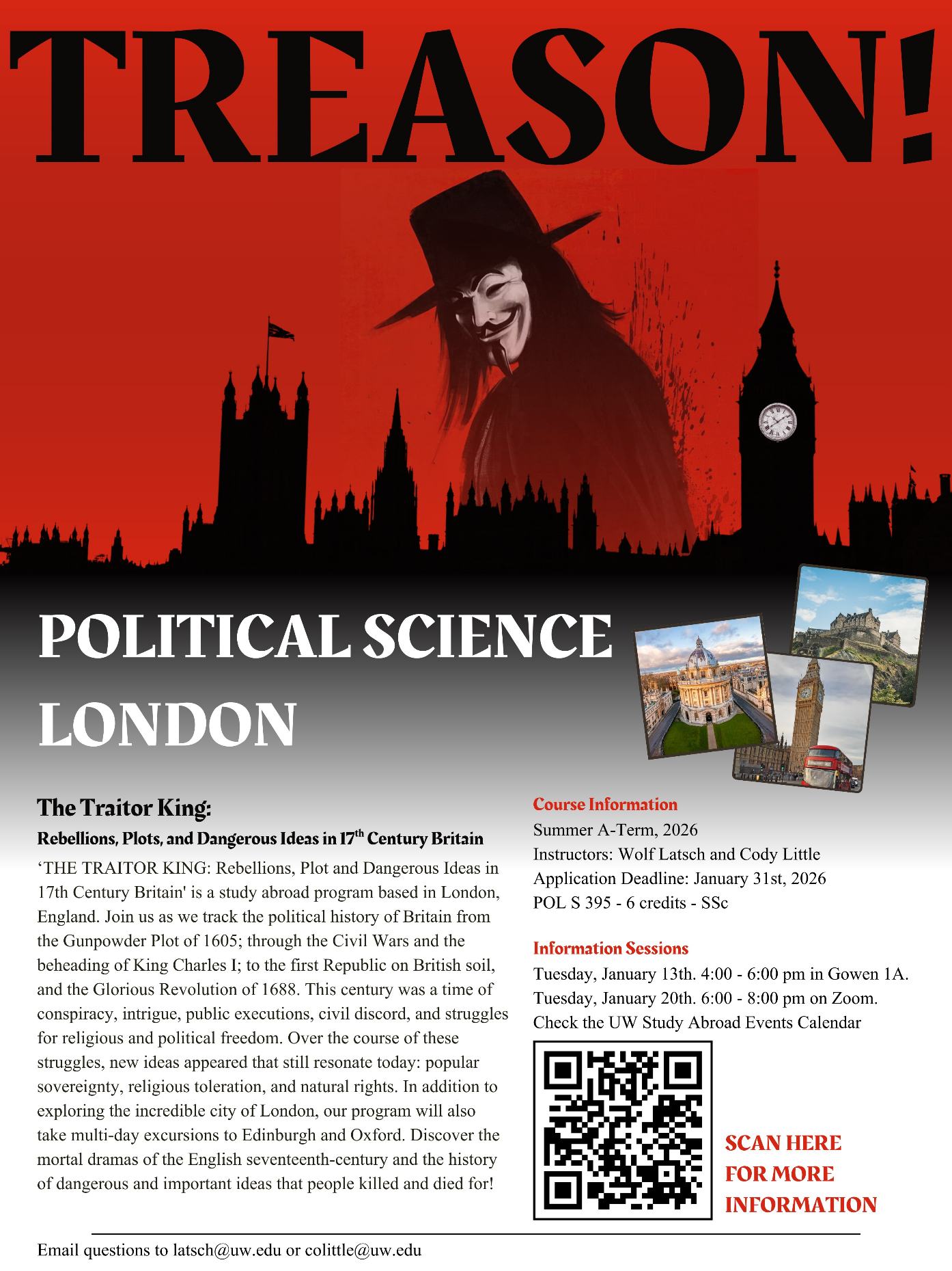 We will do tours of important sites such as Westminster Abbey, the Tower of London, and the Houses of Parliament, take guided walking tours, and discover the cities that helped shape the turmoil of 1600s Britain: London, Edinburgh and Oxford.