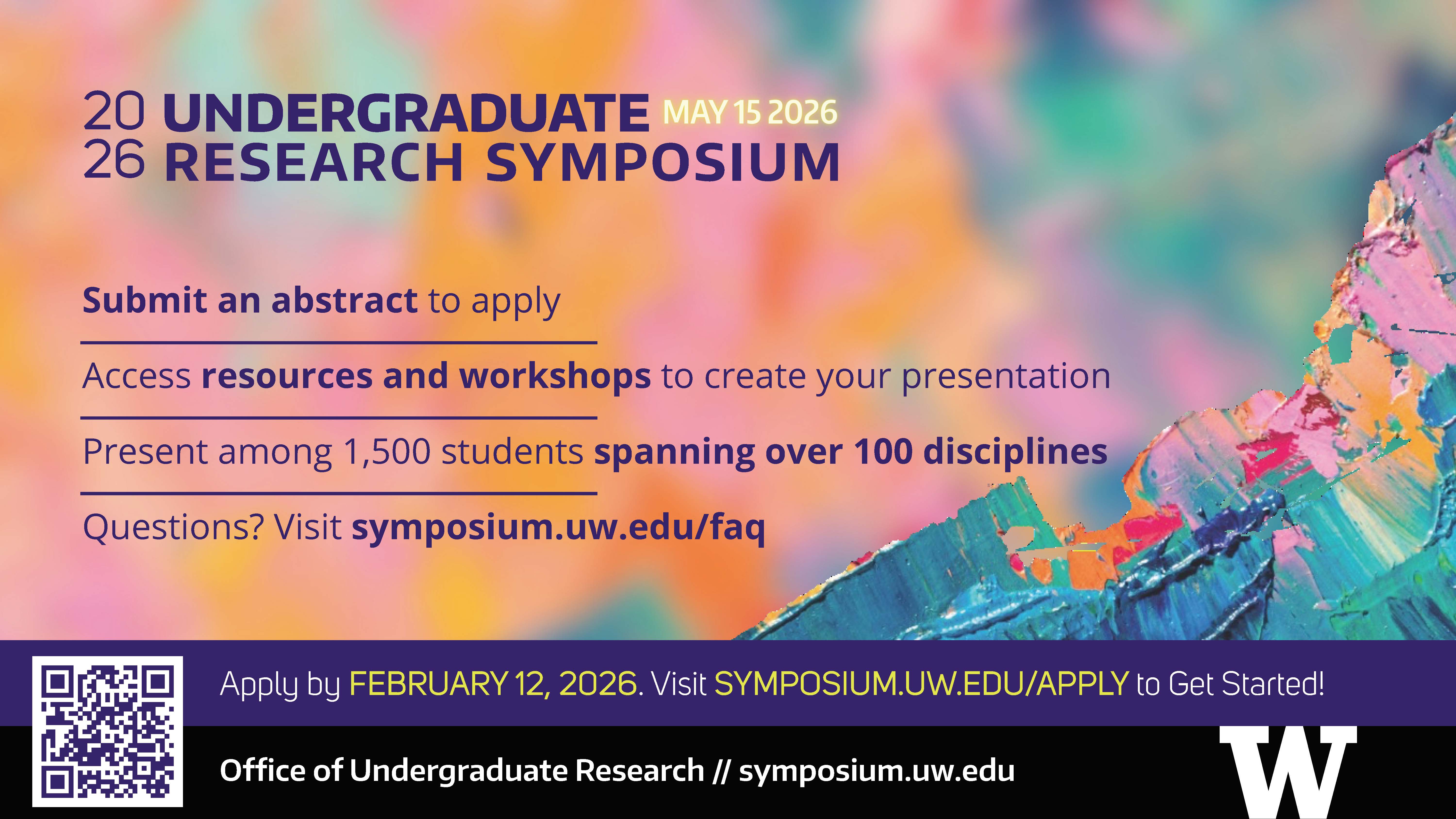 We are excited to share that the application for this year’s UW Undergraduate Research Symposium is open! The Symposium provides undergraduate students from all disciplines with a unique opportunity to present their research, scholarship, and creative work to a larger audience. Save the date for Friday, May 15, 2026, for the 29th Annual UW Undergraduate Research Symposium.