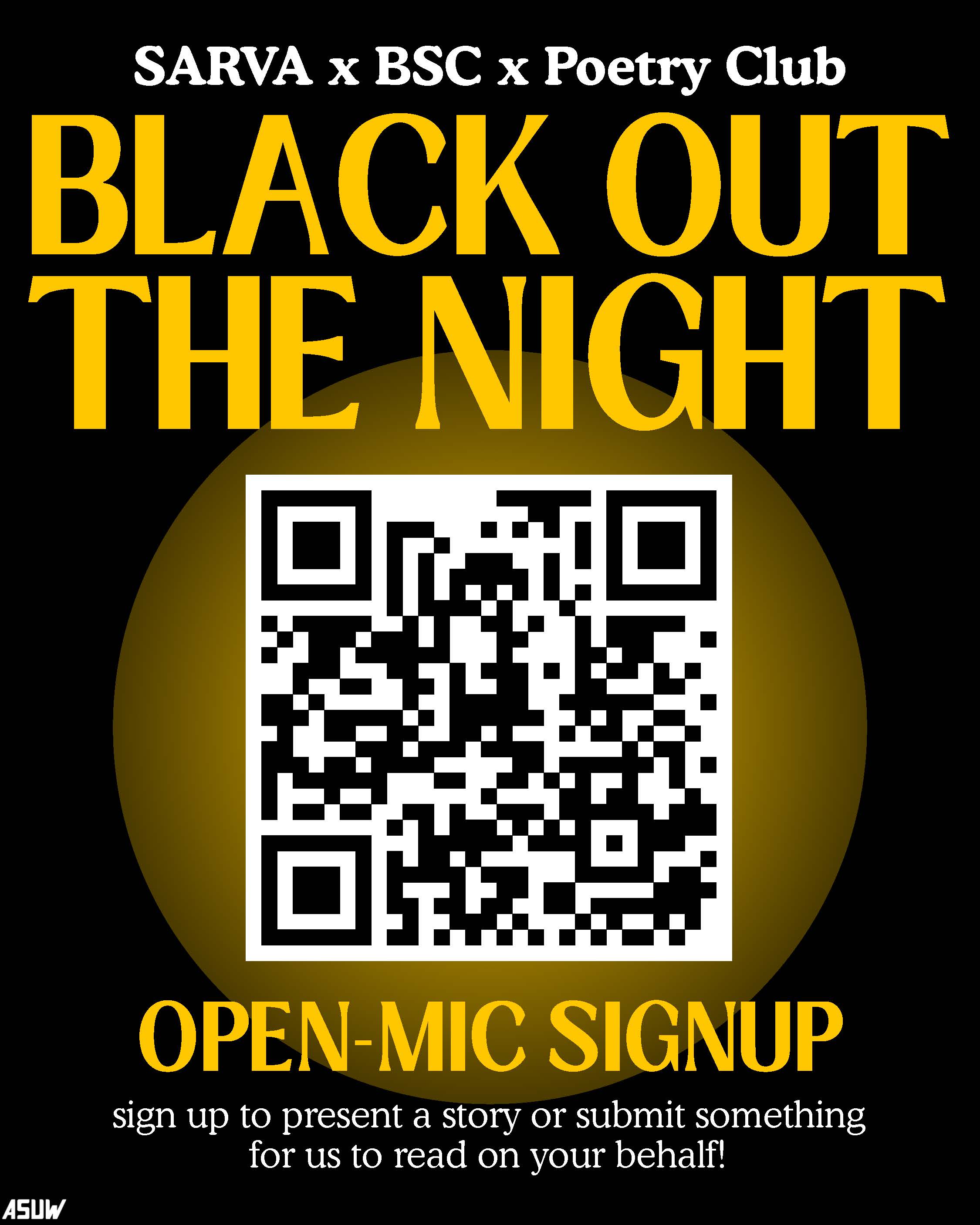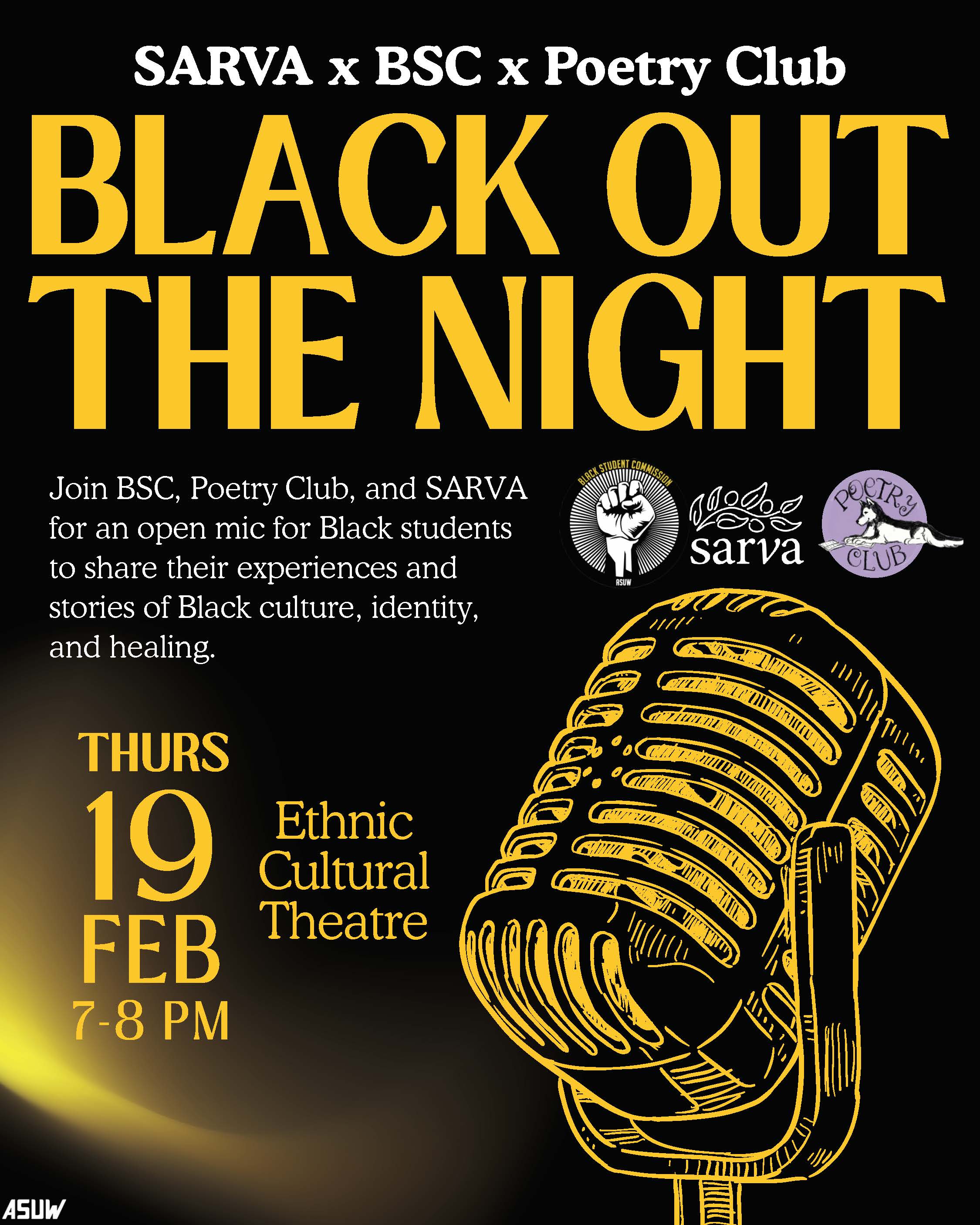 ASUW SARVA, the Black Student Commission, and Poetry Club presents Black Out the Night: an open mic this Thursday, 2/19, 7-8 PM at the Samuel Kelly EEC!