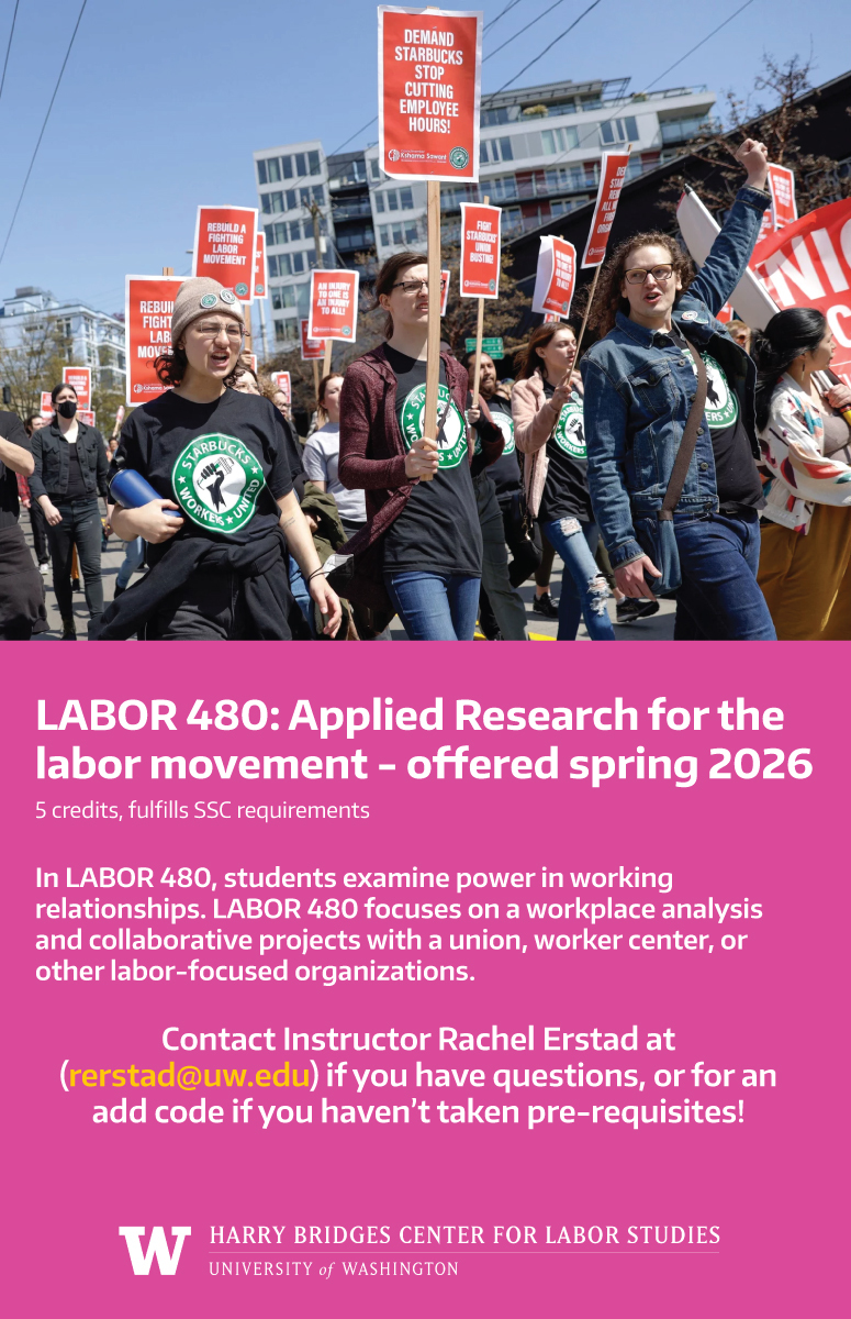 The Bridges Center will be offering LABOR 480: Applied Research for the Labor Movement this spring quarter. The MyPlan is linked here. The course focuses on a workplace analysis and a collaborative project with a labor union or worker-focused organization. We also host visitors who work in a variety of labor research roles and more. This class is great for folks interested in developing applied research skills, policy analysis, and applying an intersectional lens to workers' experiences.