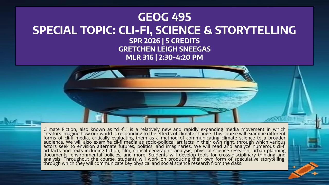 Climate Fiction, also known as “cli-fi,” is a relatively new and rapidly expanding media movement in which creators imagine how our world is responding to the effects of climate change. This course will examine different forms of cli-fi media, critically evaluating them as a method of communicating climate science to a broader audience. We will also examine cli-fi media as socio-political artifacts in their own right, through which various actors seek to envision alternate futures, politics, and imaginaries. We will read and analyze numerous cli-fi artifacts and texts including fiction, film, critical geographic analysis, physical science research, urban planning documents, environmental policies, and more. Students will develop tools for cross-disciplinary thinking and analysis. Throughout the course, students will work on producing their own form of speculative storytelling, through which they will communicate key physical and social science research from the class.